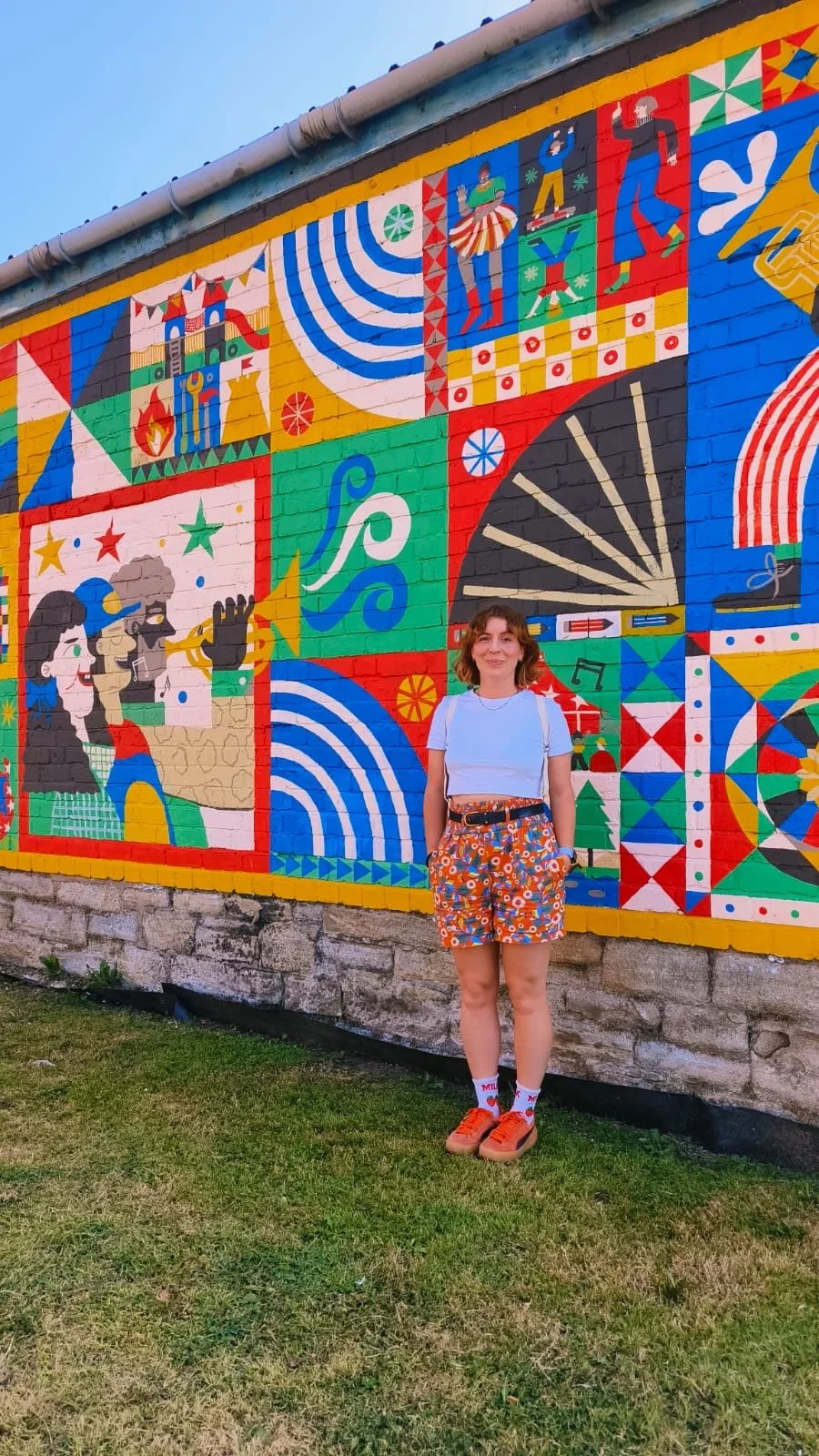 This mural design celebrates the energy and freedom of Rhyl’s seafront. Inspired by my teenage Saturdays catching the train from Wrecsam to Rhyl, I wanted to capture the joyful spirit of hanging out at the skatepark, sketching BMXers and skateboarders, and ending the day on the beach with friends.